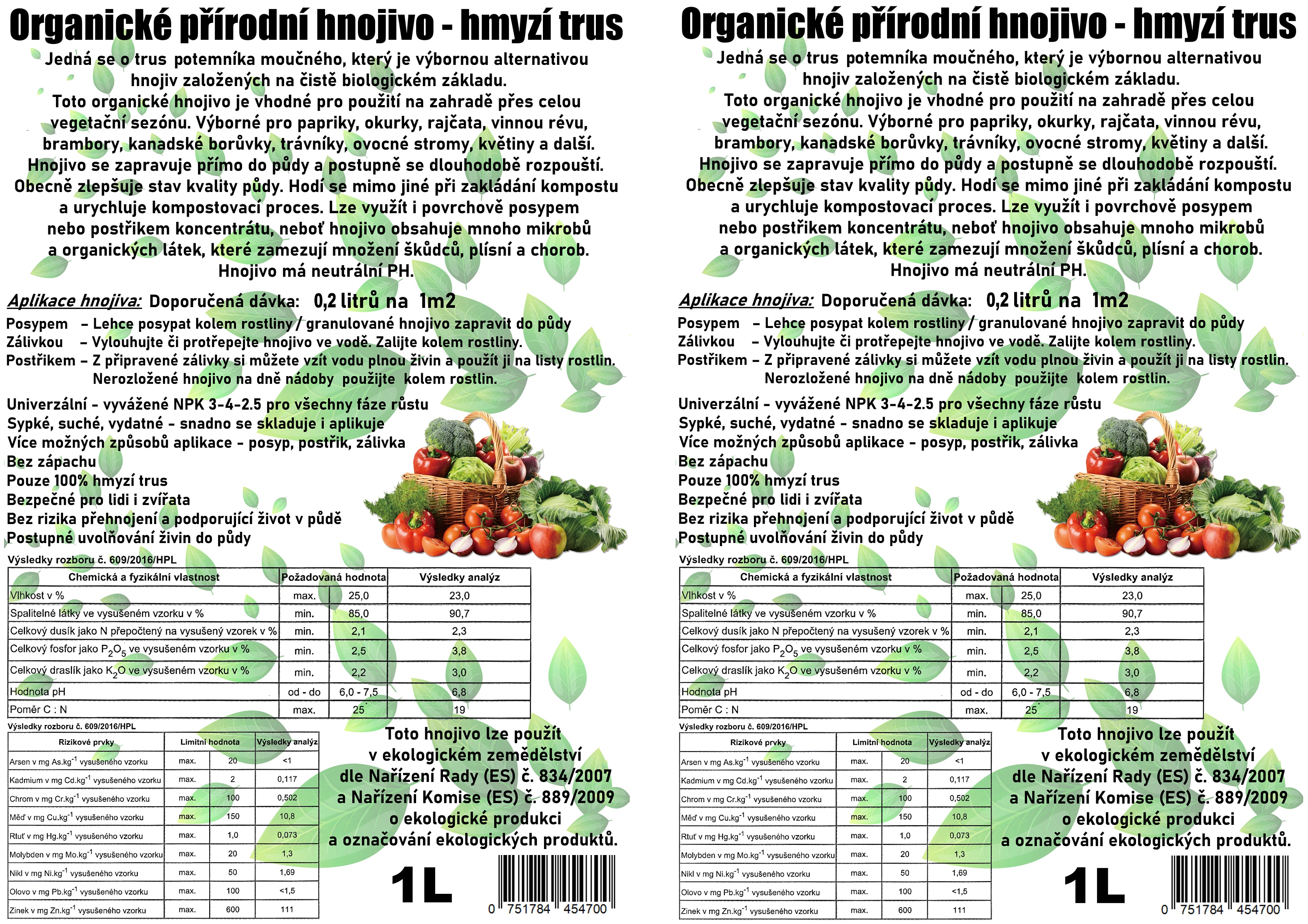 Jedná se o trus z potemníka moučného, který je výbornou alternativou hnojiv založených na čistě biologickém základu. Toto čistě biologické hnojivo je vhodné pro použití na zahradě přes celou vegetační sezonu. Výborné hnojivo pro papriky, okurky, rajčata, vinnou révu, brambory, kanadské borůvky, k ovocným stromům a dalším. Hnojivo se zapravuje přímo do země a postupně se dlouhodobě rozpouští. Obecně vylepšuje stav kvality půdy. Hodí se mimo jiné při zakládání kompostu a urychluje kompostovací proces. Lze využít i povrchově neboť hnojivo obsahuje spoustu mikrobů a organických látek, které zamezují množení škůdců, plísní a chorob. Hnojivo má na rostlinu antibiotický účinek a zlepšuje obranyschopnost. Hnojivo má neutrální PH.