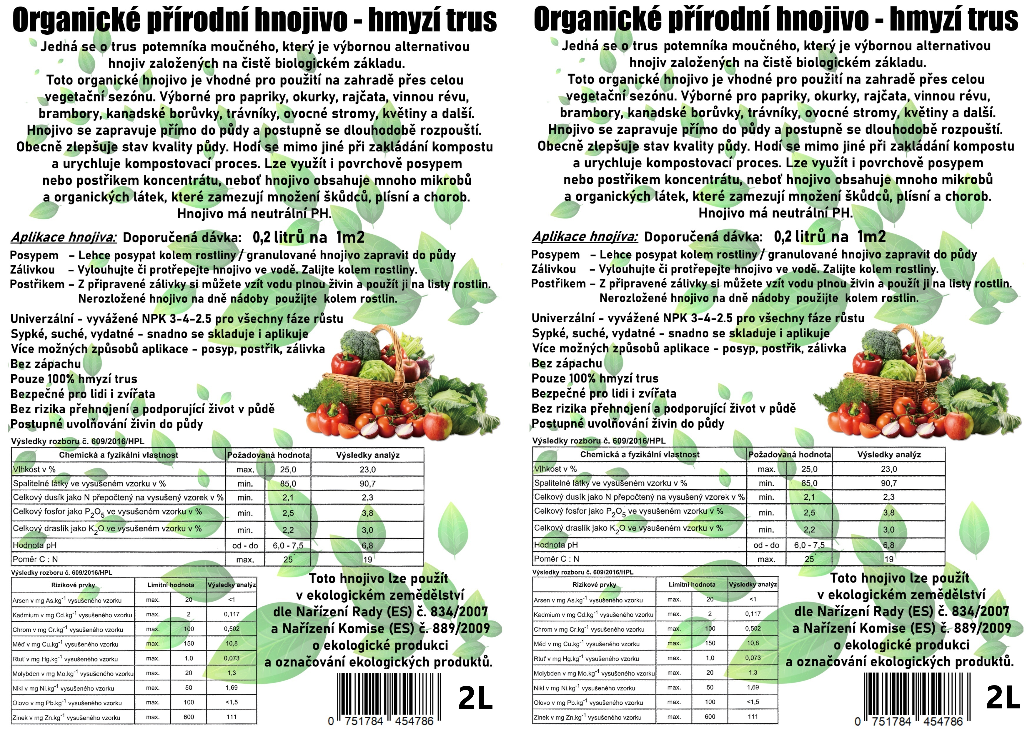 Jedná se o trus z potemníka moučného, který je výbornou alternativou hnojiv založených na čistě biologickém základu. Toto čistě biologické hnojivo je vhodné pro použití na zahradě přes celou vegetační sezonu. Výborné hnojivo pro papriky, okurky, rajčata, vinnou révu, brambory, kanadské borůvky, k ovocným stromům a dalším. Hnojivo se zapravuje přímo do země a postupně se dlouhodobě rozpouští. Obecně vylepšuje stav kvality půdy. Hodí se mimo jiné při zakládání kompostu a urychluje kompostovací proces. Lze využít i povrchově neboť hnojivo obsahuje spoustu mikrobů a organických látek, které zamezují množení škůdců, plísní a chorob. Hnojivo má na rostlinu antibiotický účinek a zlepšuje obranyschopnost. Hnojivo má neutrální PH.